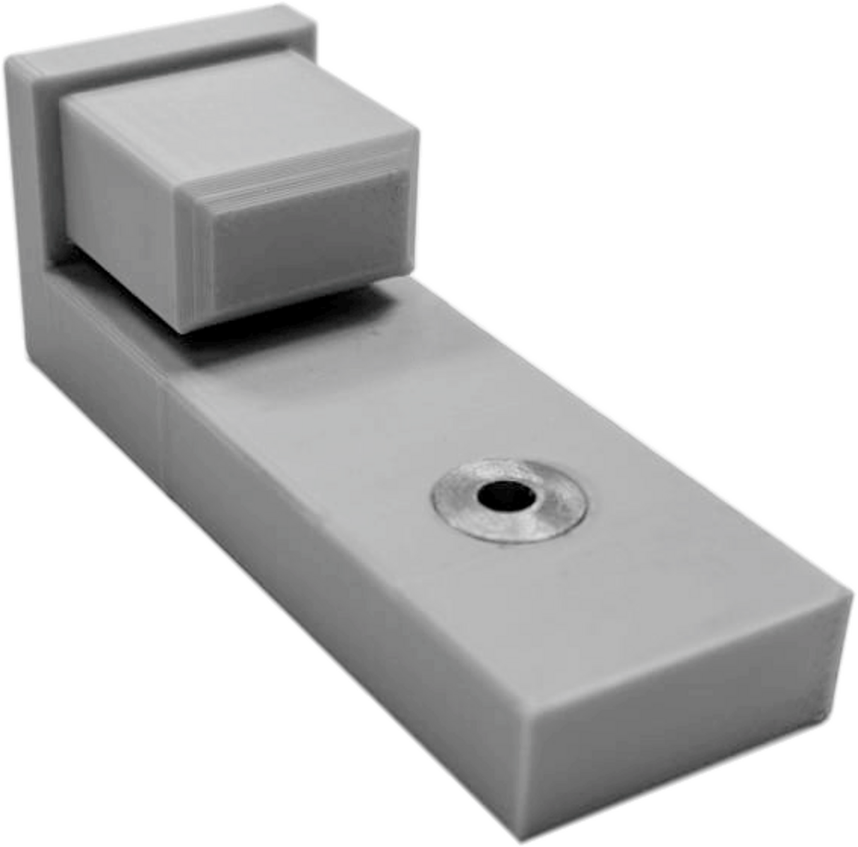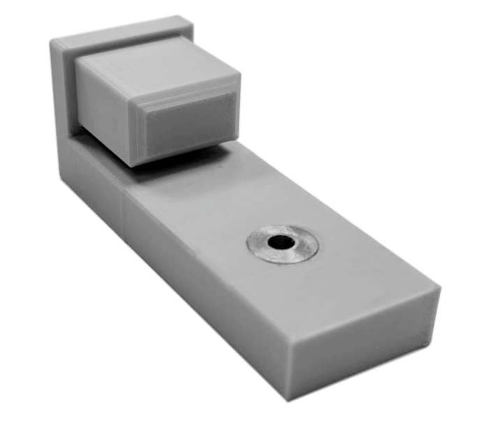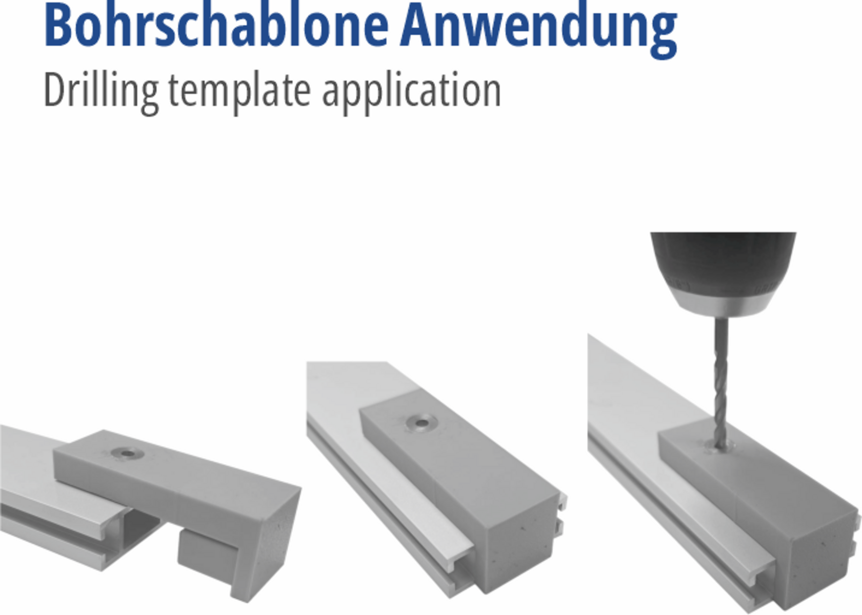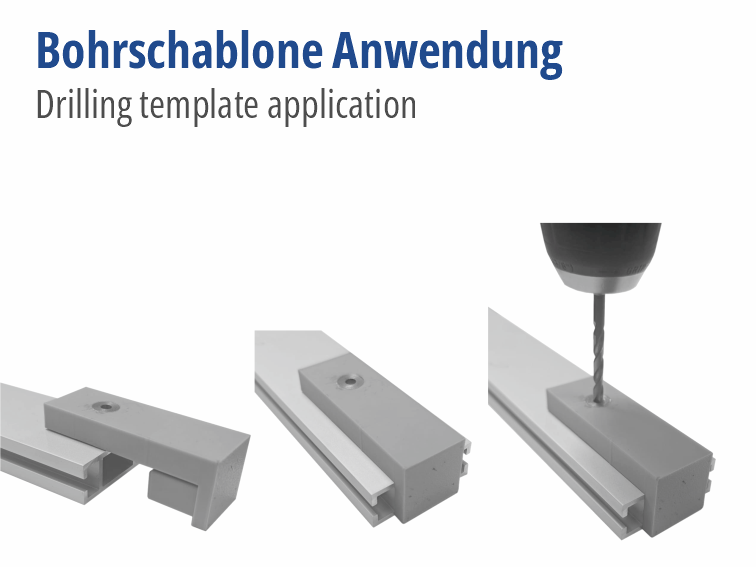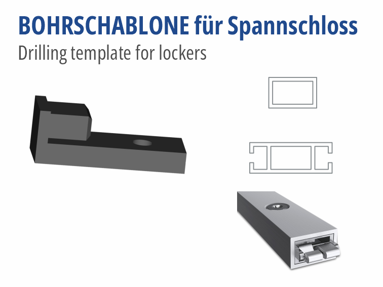 Auf die Verstrebungsprofile kann diese Schablone aufgeschoben werden. Sie hilft, das Bohrloch für die Spannschlösser ohne anzeichnen rasch und exakt an der richtigen Stelle zu setzen. Eine gehärtete Buchse sorgt für die Führung des 3,5mm Bohrers und verhindert einen Verschleiss der Schablone. Die eigentliche Bohrung erfolgt dann mit einem 13mm Bohrer!