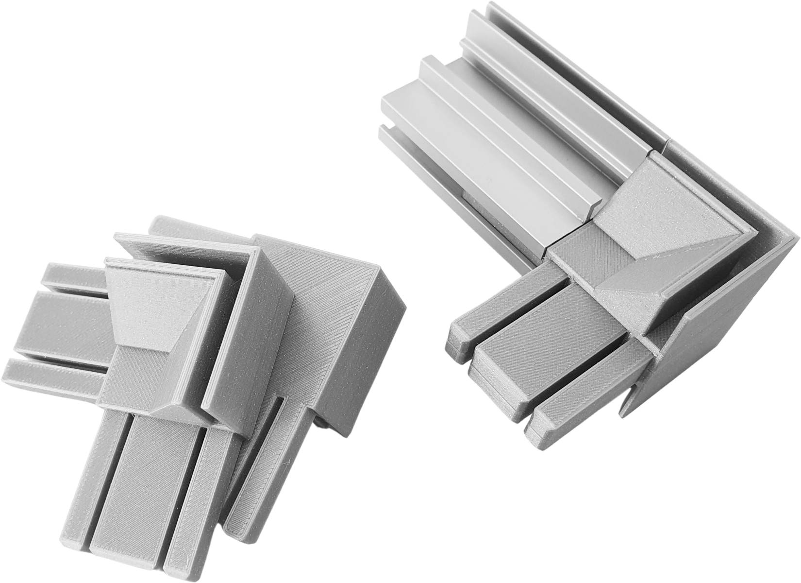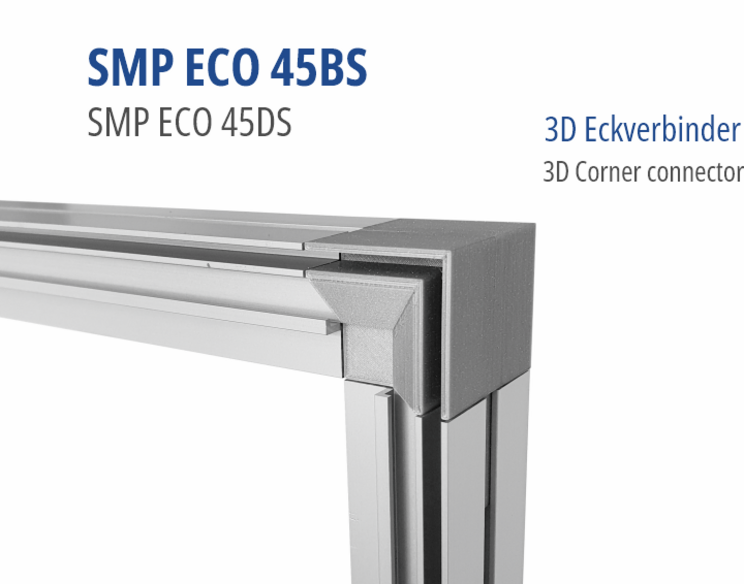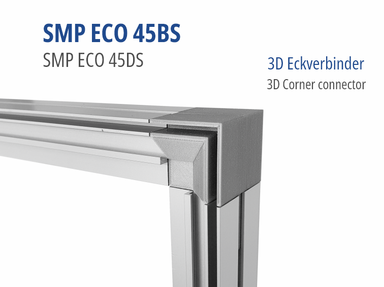 Keine Gehrungsschnitte mehr erforderlich. SMP Eco45 gerade abschneiden und mit diesem Eckverbinder werkzeuglos zusammensetzen. Nach dem Einloggen können Sie kostenlos 3D-Druckdaten herunterladen oder fertig gedruckte Verbinder direkt bei uns bestellen.