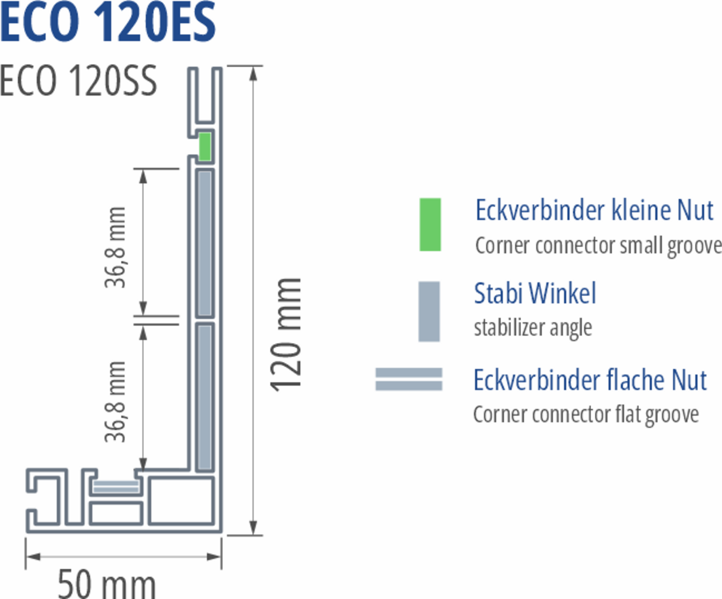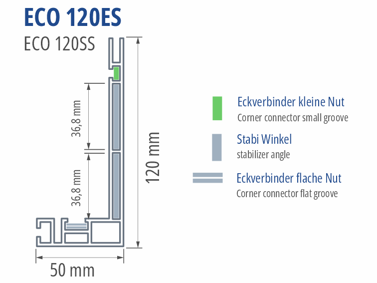 Eckverbinderset für Eco 120es Rahmen besteht aus je 4 Eckverbindern kleine Nut, 4 Eckverbindern flache Nut und 8 Eckverbinder Hohlkammer 36,8mm