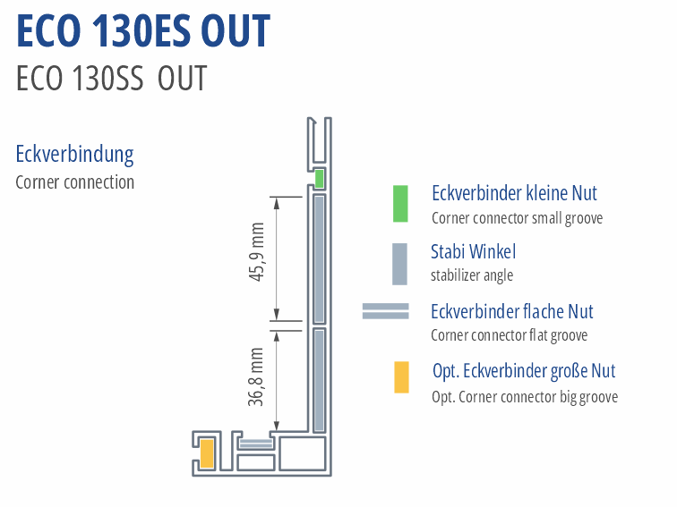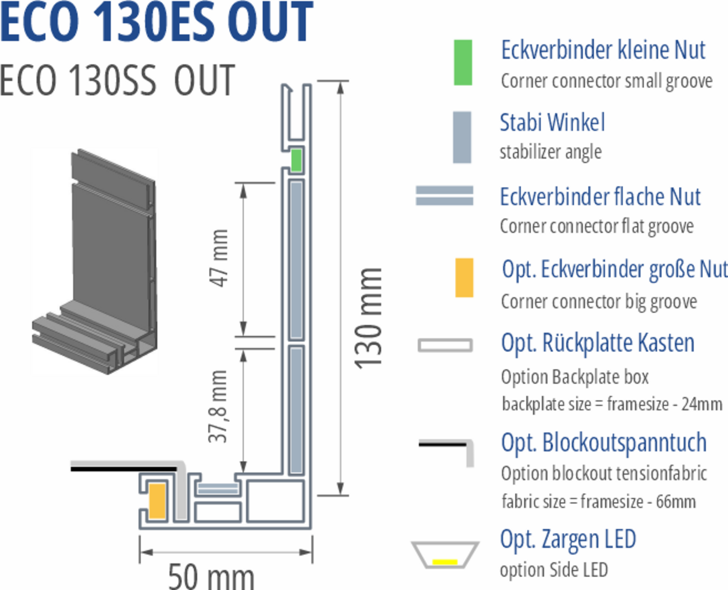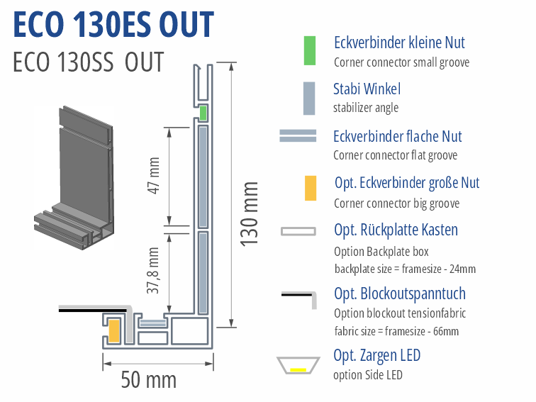 Das Eco 130es OUT ist ein eloxiertes Aluminiumprofil für große einseitige LED-Leuchtrahmen im Außenbereich. Die integrierte Gummilippentechnik mit Widerhaken sorgt für sichere Tuchverankerung auch bei Wind. Das Profil verfügt über einen eigenen Schraubkanal und wird alle 30-70 cm direkt an der Wand oder Unterkonstruktion verschraubt. Die tiefe Flachbandnut mit Widerhaken nimmt Spanntücher mit Gummilippe auf. Nach der Profilmontage kann eine weiße Rückwand als Spanntuch eingesetzt werden. Verstrebungen lassen sich über Schnellspannschlösser befestigen. Mit 2,8W LED-Modulen erreicht das Profil homogene Ausleuchtung bis 3 Meter, mit Ultra LEDs sogar bis 5 Meter. Der Widerhaken sichert das Spanntuch zuverlässig gegen Sturmeinwirkung. Geeignet für mittlere und große Fassadenwerbeanlagen, Schilderanlagen und LED-Leuchtrahmen im gewerblichen Außeneinsatz.