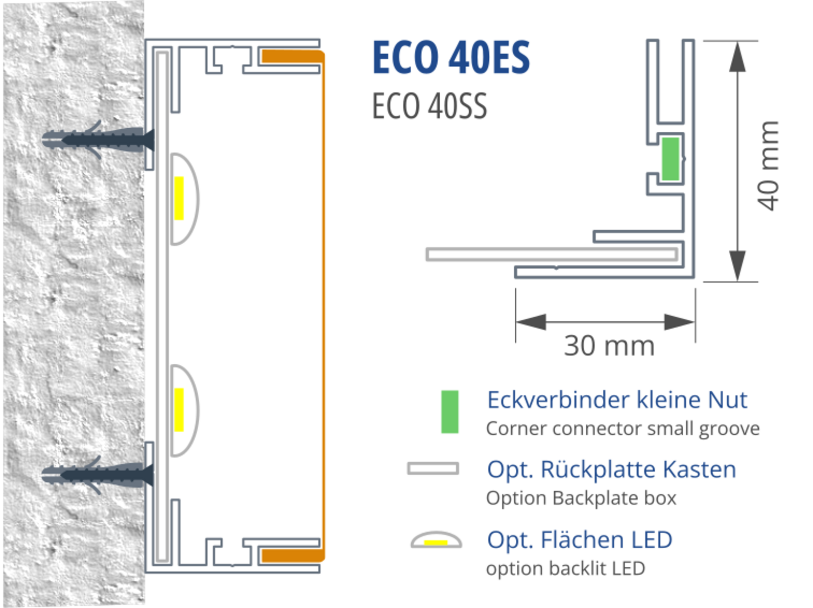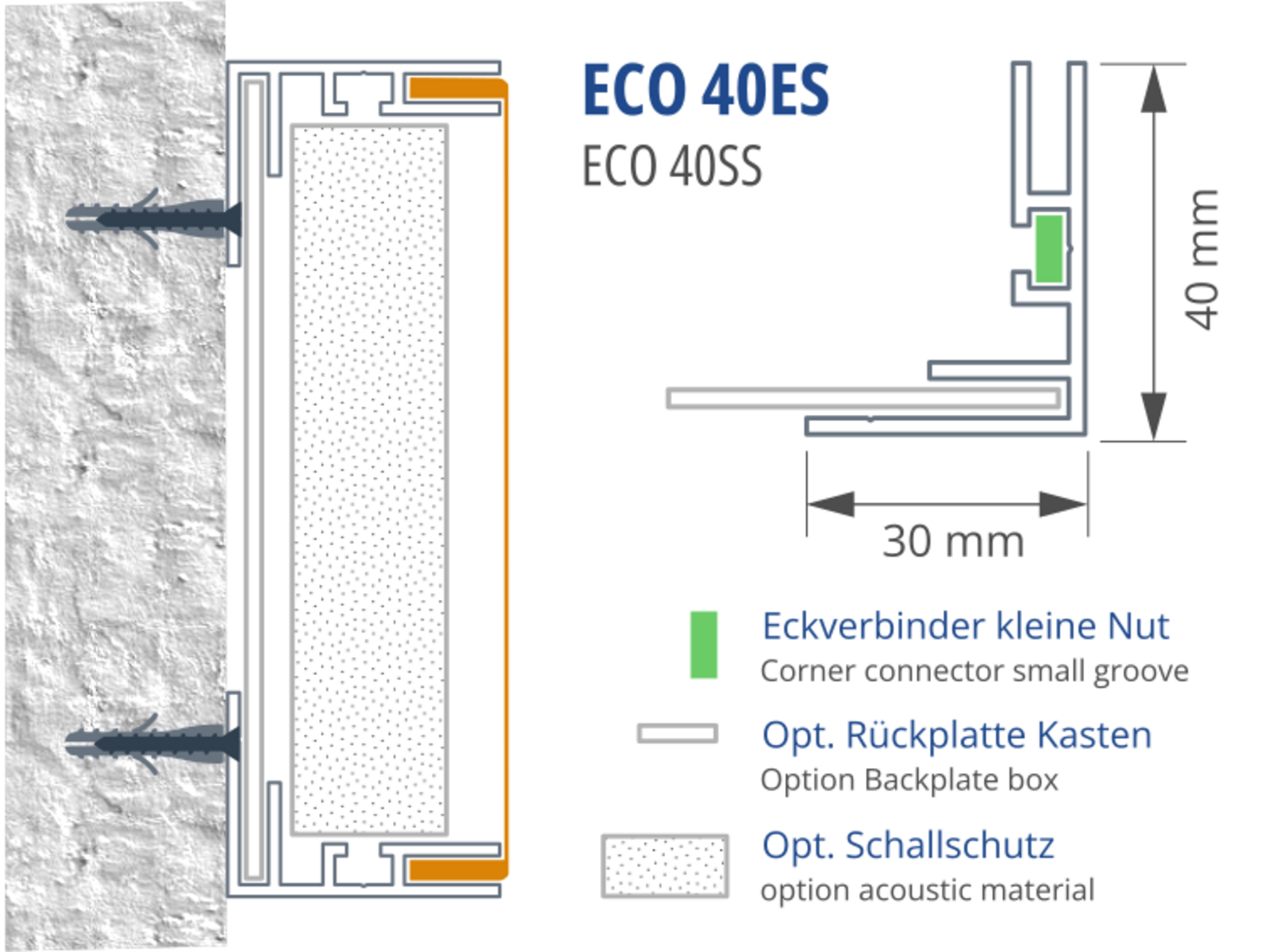 Einseitiges Flachbandprofil mit 40mm Bautiefe für sehr schlanke Leuchtkästen oder Schallschutzbilder.