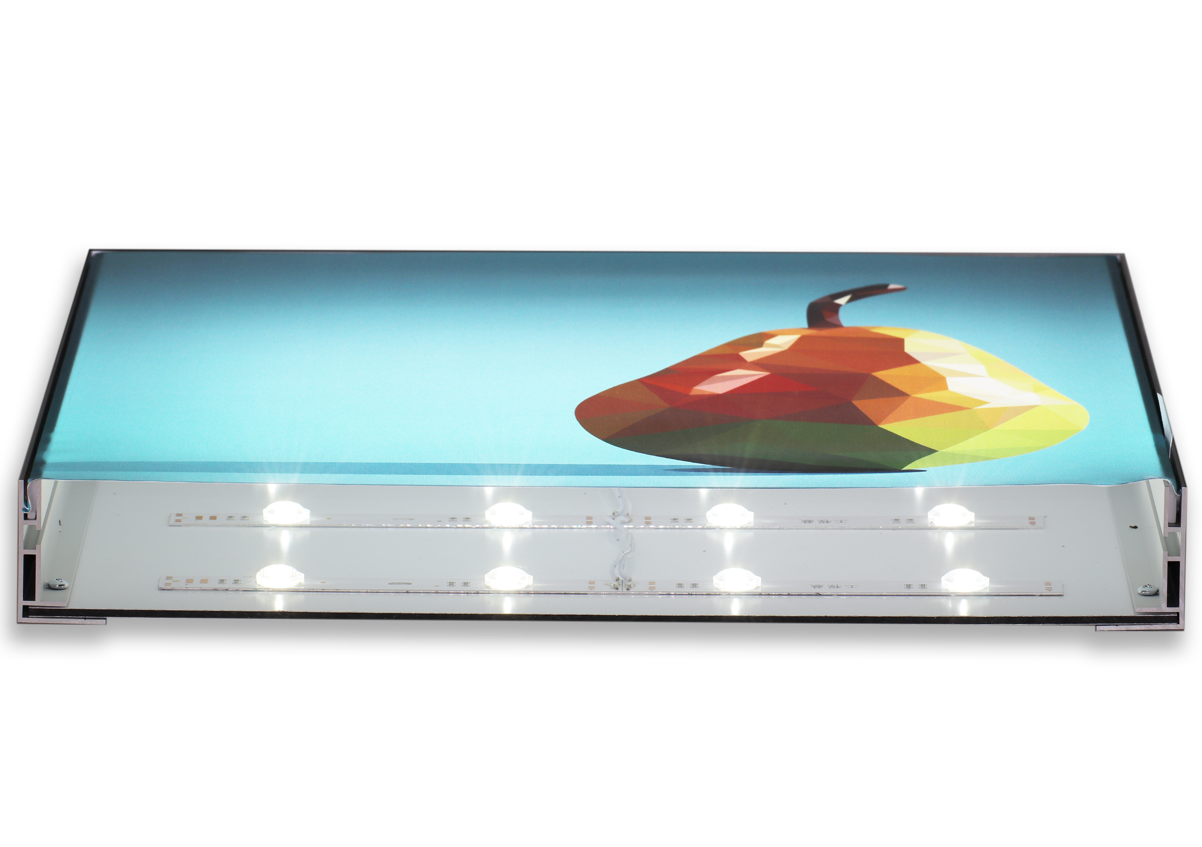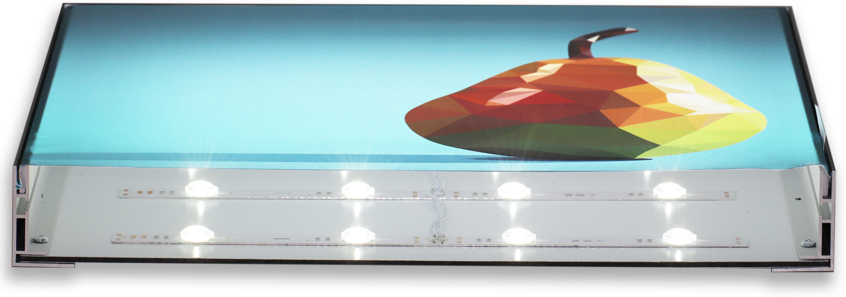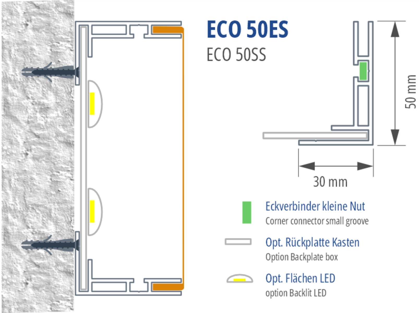 Das Eco 50es ist ein einseitiges Indoor-Leuchtkasten-Profil mit 50mm Bautiefe für flache Wandmontage-Leuchtkästen. Montage über Rückplatten oder untere Leiste zuerst mit versenkten Schrauben. Eigenstabilität bis Format 1.000×1.500mm ohne zusätzliche Verstärkung.