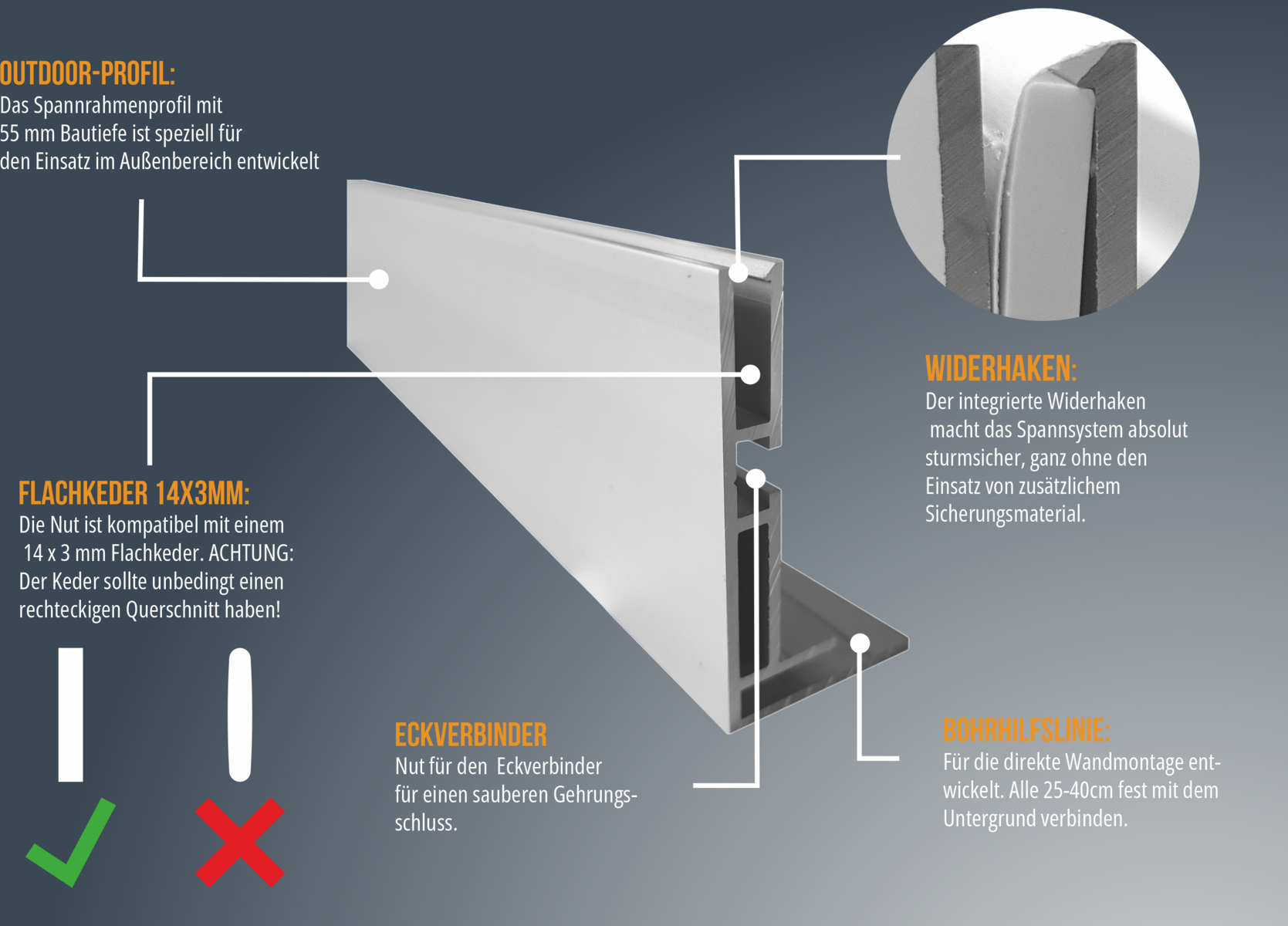 Das Profil für superschlanke, beleuchtete Gummilippenspannrahmen im AUSSENBEREICH! Der Widerhaken am innenliegenden Steg sorgt für absolut sicheren Halt des Spanntuches OHNE jegliche zusätzliche Sicherung!
