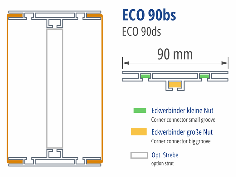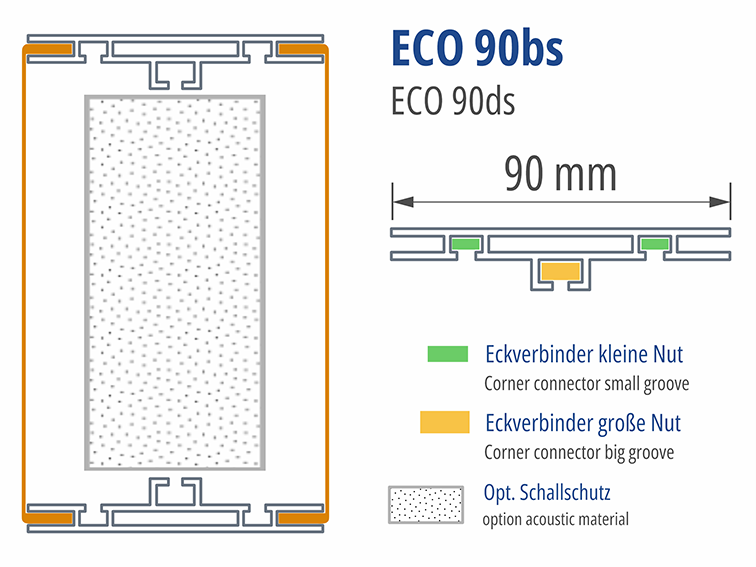 90 mm schlankes Profil zur Herstellung beidseitig leuchtender Anwendungen. Sofern eine der beiden Rahmenseiten ca. 120 cm nicht überschreitet, werden über die Zarge gute Ausleuchtungsergebnisse erzielt. Dank der Verstrebungsaufnahme lassen sich auch großformatige Anwendungen wie Deckenkränze effizient realisieren – besonders vorteilhaft in Kombination mit unserem Innen- und Außeneckprofil. Mit unserem Plexiadapter kann beidseitig anstelle von Spanntuch mit Gummilippe auch Plattenmaterial bis zu 5 mm Stärke eingesetzt werden.