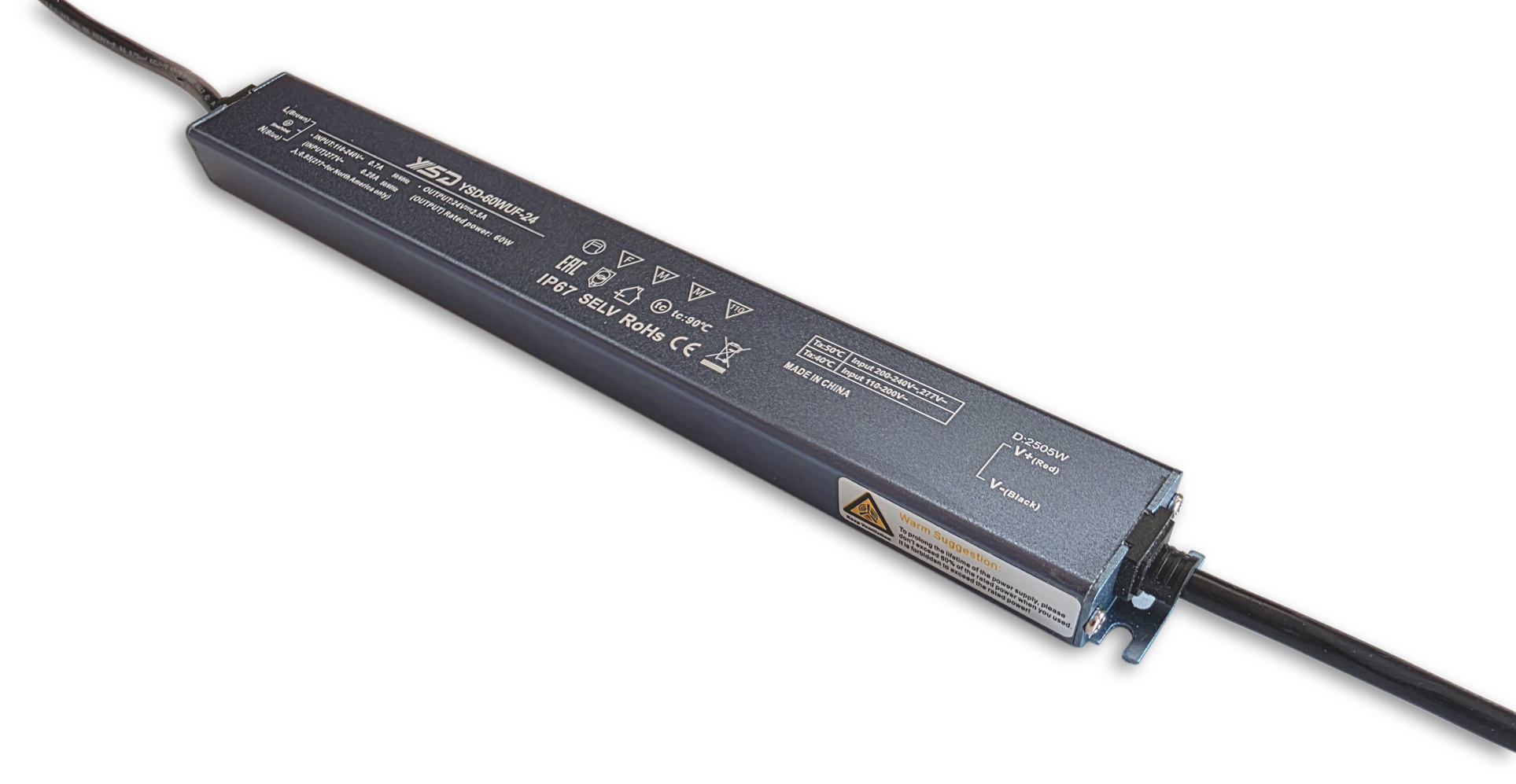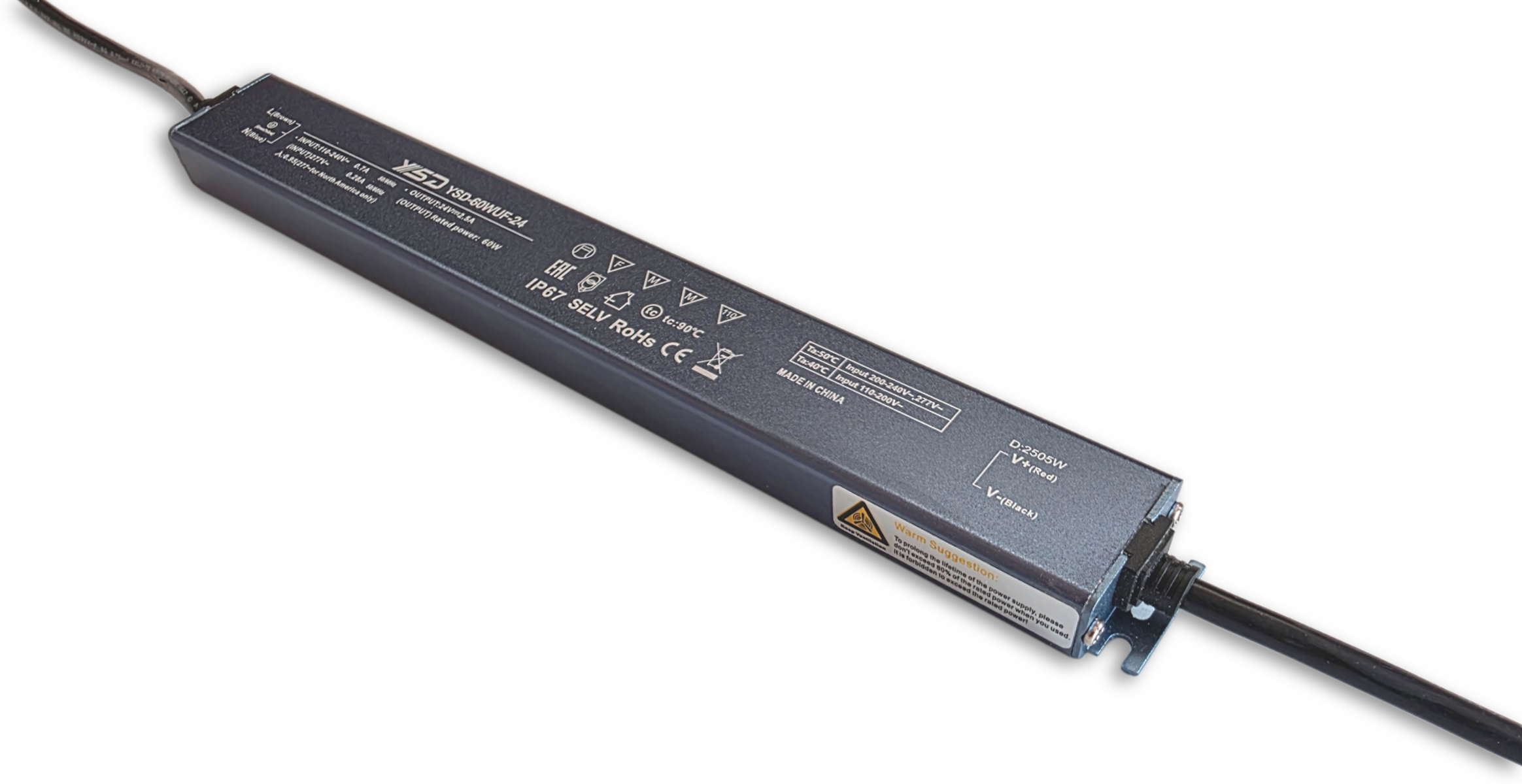 Das Modell YSD-60WUF-24 liefert konstante 24 V DC bei satten 60 W und bis zu 2,5 A – perfekt für leuchtstarke LED-Systeme. Mit einem Spitzenwirkungsgrad von knapp 90% wandelt das Netzteil Strom nahezu verlustfrei – weniger Abwärme, längere Lebensdauer. Das ultraflache Lineargehäuse misst nur 18mm in der Höhe und lässt sich selbst in engste Profile oder Möbelnischen integrieren. Dank IP67-Schutzklasse bleibt die Versorgung auch in rauen Umgebungen stabil. Das Netzteil ist gegen Kurzschluss, Überlast, Überspannung und Übertemperatur geschützt. Ob LED-Strips, Panels oder Light-Boxen – dieses Netzteil liefert flimmerfreie, langlebige Power für anspruchsvolle Lichtkonzepte. ACHTUNG: 20% Reserve in der Auslastung einrechnen um eine lange Lebensdauer zu gewährleisten.