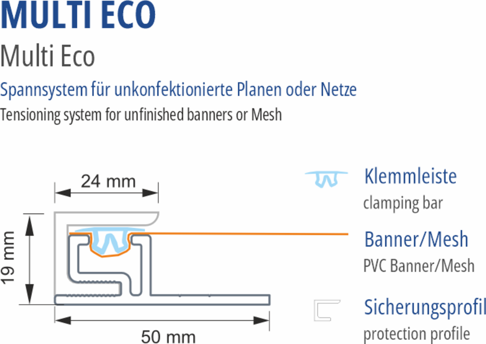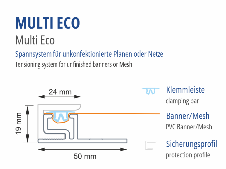 Aluminiumprofil für die Planen Montage im Außenbereich mit einer Bautiefe von 19mm. In Kombination mit dem Sicherungsprofil absolut auszugssicher. Keine Konfektionierung der Plane notwendig - daher ideal geeignet für Giebeldächer, Tor- oder Fensterausschnitte. Erhältlich als individueller Rahmenzuschnitt oder als Stangenware in 6100mm.